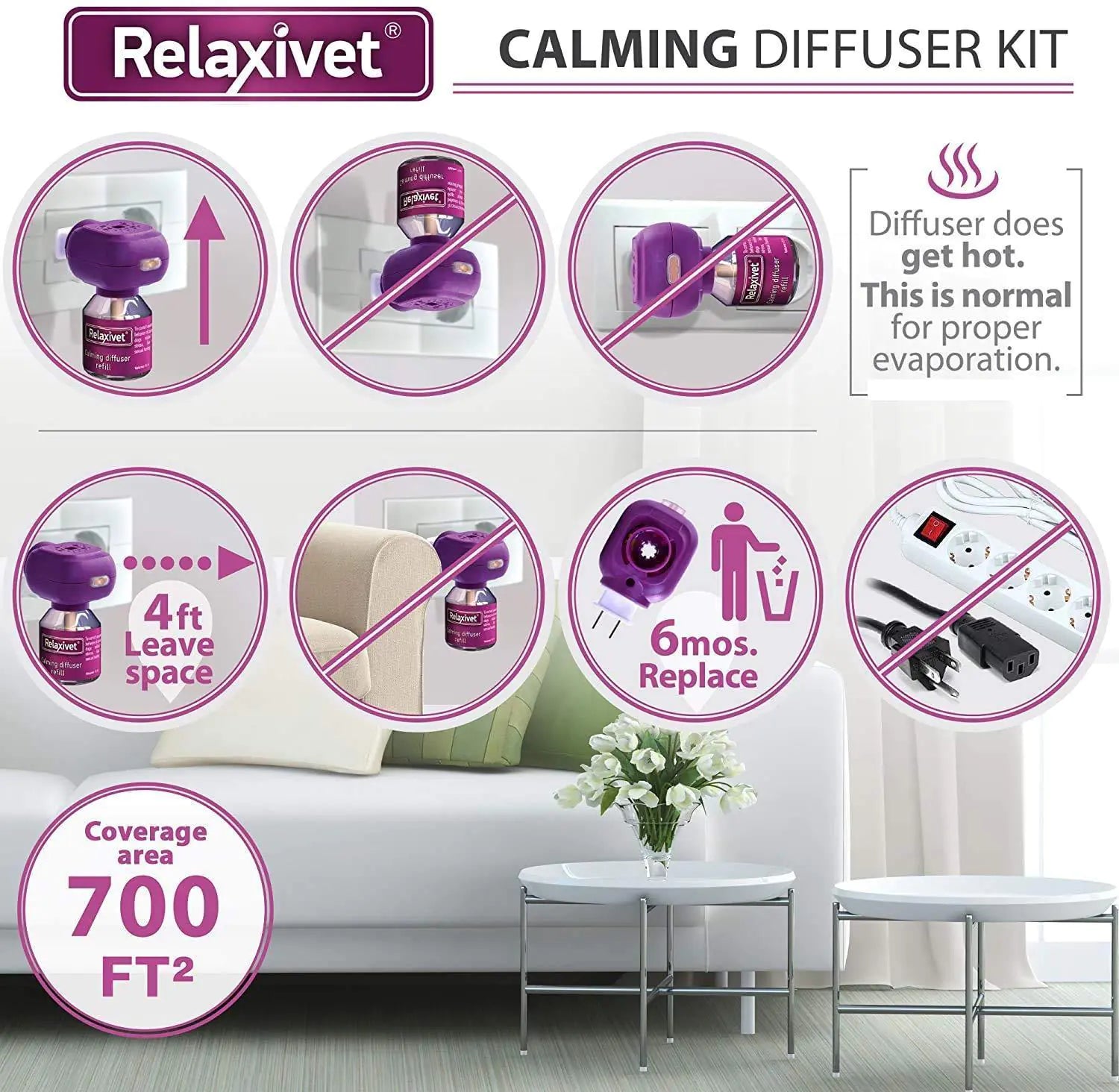 HOW TO USE: The air diffuser with refill kit covers an area of up to 700 square feet for 30 days of use. After that, you need to replace the oil refill. Plugin upright into a wall outlet with vents facing up and never into power strips. Unsafe use can cause the diffuser's increase odor or leak.