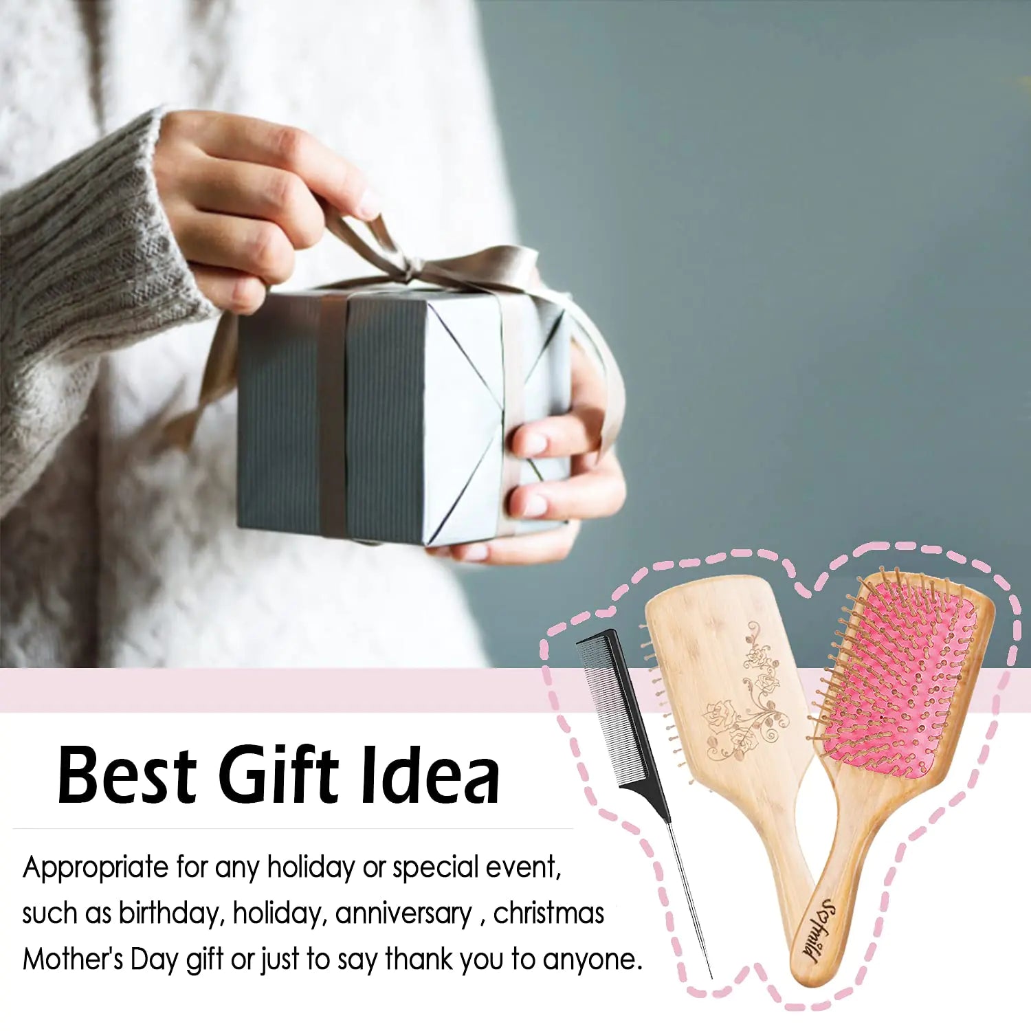Sofmild Hair Brush-Natural Wooden Bamboo Brush-Eco Friendly Detangle Paddle Hairbrush for Women Men and Kids Massage Scalp Increase Hair Growth Rose